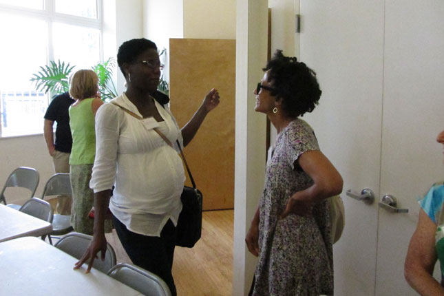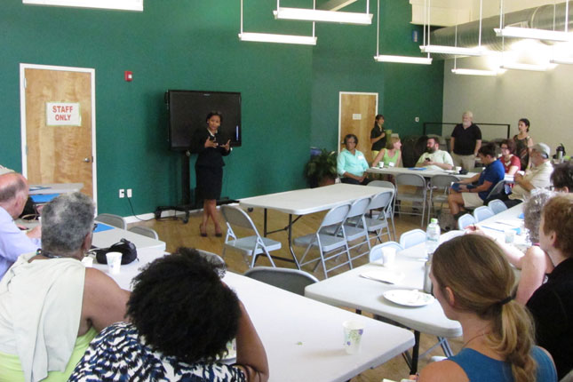 At lunch, catered by Newark’s own Harvest Table, we heard from Stephanie Greenwood of Victoria Foundation who presented an overview of urban agriculture in Newark and detailed many of the people and organizations working to grow food and distribute it in the city. She was joined by Master Gardener Carla Greene who spoke about her experience running her own garden as well as being a Newark Garden Ambassador. We were also joined by Baye Adofo-Wilson, Newark’s Deputy Mayor for Economic and Housing Development, and Dr. Hanaa Hamdi, Director of the Newark Department of Health and Community Wellness. Dr. Hamdi discussed her research on the role of social and structural impacts on health, and how one’s health is an outcome of many overlapping systems as opposed to just personal choice.