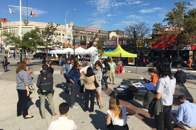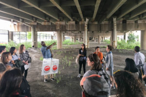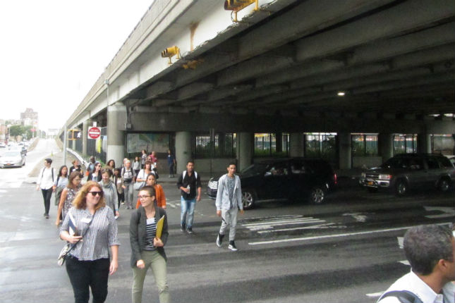 From The Point we took a short bus ride to the intersection of Bruckner Boulevard and Bronx River Ave. The destination was a vacant 22,500sf strip of land beneath the elevated Bruckner Expressway. Once there, David Shuffler, Executive Director of Youth Ministries for Peace and Justice (YMPJ), asked us to envision the future Soundview Marketplace, a bustling community space serving as a hub for healthy food production and distribution, providing incubator space for food manufacturing businesses and a critical access point for fresh produce and prepared foods. YMPJ has an agreement with the State Department of Transportation who owns the land to develop this project as part of the larger Bronx River Greenway and Bronx Foodway vision.