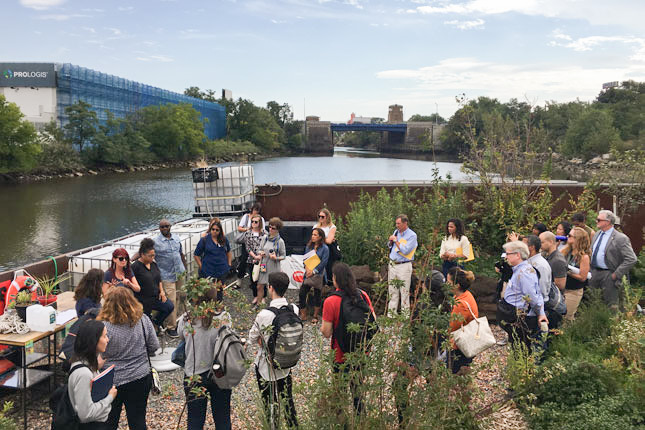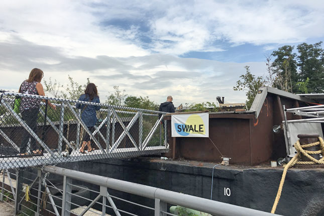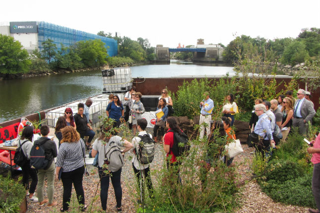 We then walked back across the Bronx River to our final destination, Concrete Plant Park. The park is currently home to Swale, a floating food forest built atop a working barge that we boarded upon arrival. We heard from the Swale team as well as YMPJ staff about their collaborative efforts to bring this interactive edible art piece to the community and went on a short foraging tour of our own.