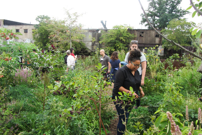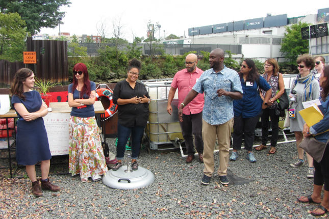 After disembarking, we were led through the genesis and future plans of Concrete Plant Park and the Bronx Foodway by representatives of NYC Parks, the Bronx River Alliance, and YMPJ. These three organizations, along with The Point and Partnership for Parks, comprise the core team of the Foodway, which had its first season of plantings this summer. The Foodway is a productive eco-cultural corridor landscaped with edible, medicinal, and other useful plants envisioned to impact community health as part of the #Not62 campaign. We went on a tour of the different Foodway features already built, and heard about community efforts to reclaim the waterfront land at the site of a former concrete factory, prevent it from becoming more highway infrastructure, and turn it into this beautiful park instead.